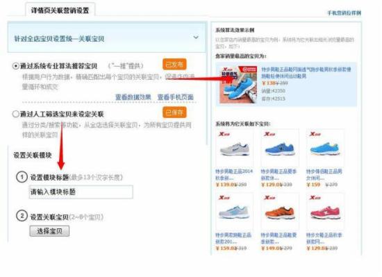 (2)系统推荐关联:a、通过系统推荐——通过用户行为数据,精选匹配每个宝贝的关联宝贝;b、通过人工筛选。