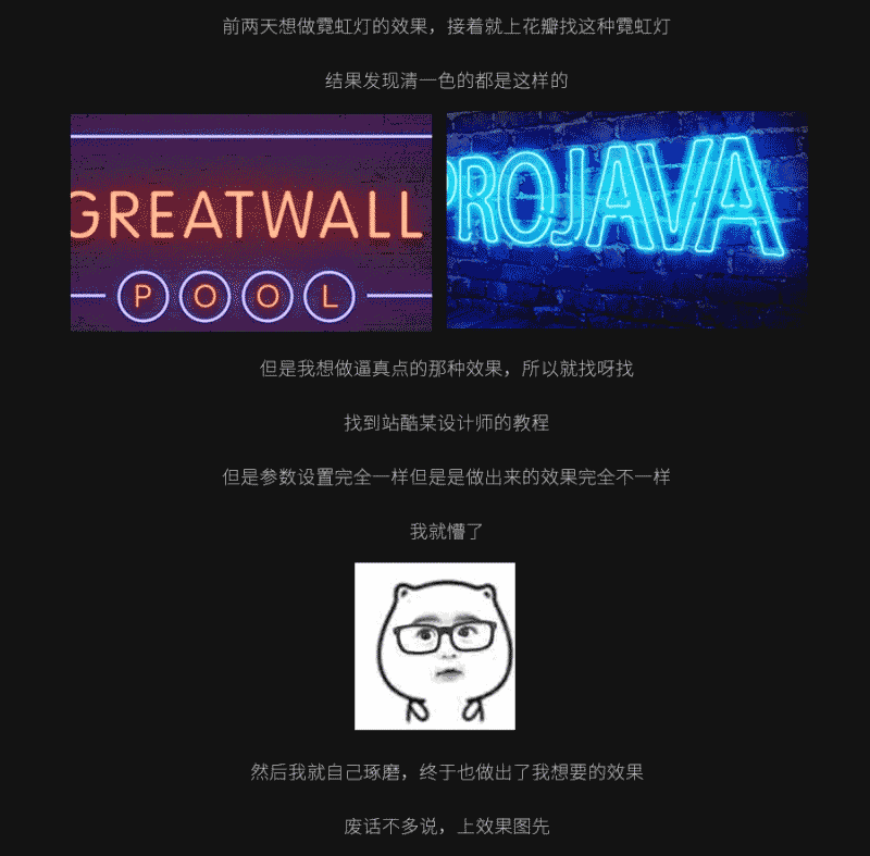 前两天先做霓虹灯效果,接着就再网络上找霓虹灯教程,但是很多教程出来的效果都不是我想要的,不够逼真。之后经过自己的琢磨,终于也做出了我想要的效果,废话不多说先看看我的效果图: