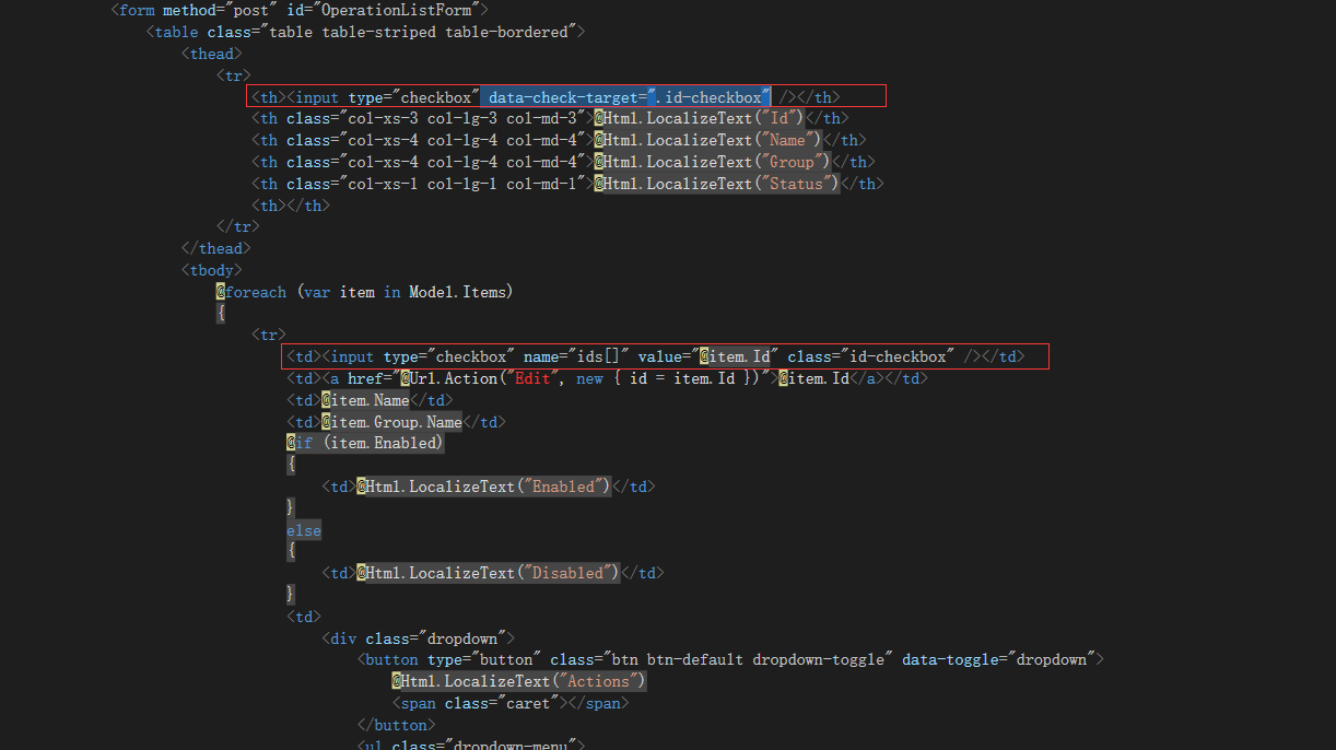我发现全选复选框用于和js链接的桥梁的自定义属性data-check-target有点特别: