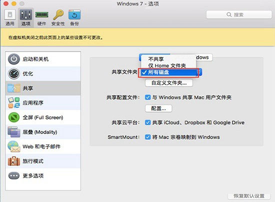3、在界面中选择“选项”界面,点击“共享”设置“共享文件夹”,默认情况下设置为“仅Home文件夹”,点击下拉按钮选择“所有磁盘”,此时虚拟机系统将与mac系统共享所有磁盘的文件夹。