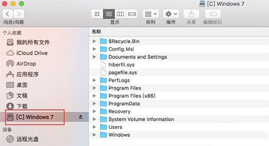 4、此时,打开mac系统中的“Finder”,在左边的列表中可以看到windows虚拟机磁盘,点击并可看到虚拟机中所有的文件夹,可随时进行查看。