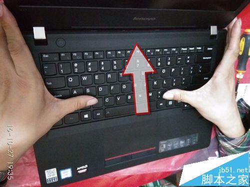 2、把笔记本翻转到正面向上,双手大姆指稍用力向下压着键盘,向如图箭头所示的屏幕方向推动键盘。