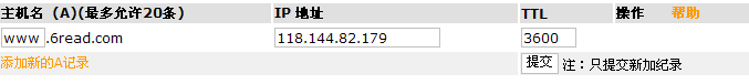 以我的卓越网上书店(www.6read.com)为例,我的虚拟主机的IP地址是:118.144.82.179;我要使我的网站www.6read.com可以正常访问,首先我就要通过A记录解析,方法如下: