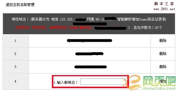因为我之前绑定了三个域名,所以这里可以看到我已经绑定了三个;在“输入新域名”的框框里输入你需要使用的域名,因为我之前用www.6read.com解析到了这个空间上,所以这里我应该填入“www.6read.com ”。然后点击后面的“添加”。