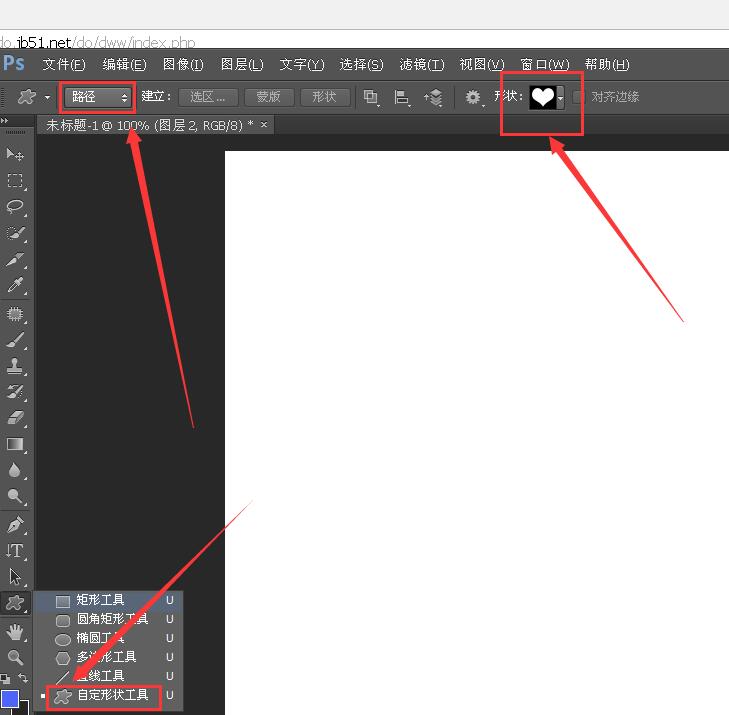 1、在PS中新建一个空白文档,选择“自定义形状”,模式为“路径”,形状选择为“心形”;