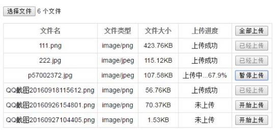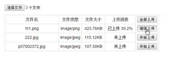 这个例子实现了文件断点续传的基本功能,不过手动的“暂停上传”操作还未实现成功,可以在上传过程中刷新页面来模拟上传的中断,体验“断点续传”、