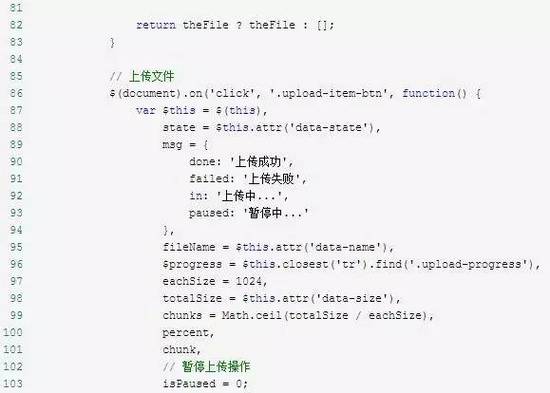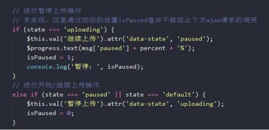 $progress.text(msg['in'] + percent + '%'); // 这样设置可以暂停,但点击后动态的设置就暂停不了.. // if (chunk == 10) { // isPaused = 1; // } console.log(isPaused);
