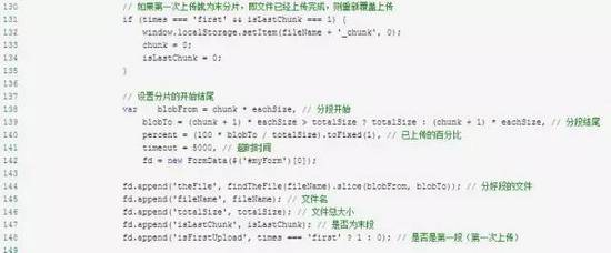 fd.append('theFile', findTheFile(fileName).slice(blobFrom, blobTo)); // 分好段的文件 fd.append('fileName', fileName); // 文件名 fd.append('totalSize', totalSize); // 文件总大小 fd.append('isLastChunk', isLastChunk); // 是否为末段 fd.append('isFirstUpload', times === 'first' ? 1 : 0); // 是否是第一段(第一次上传)