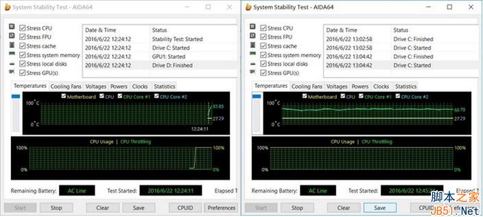 ▲烤机测试伊始、以及运行测试30分钟后结束
