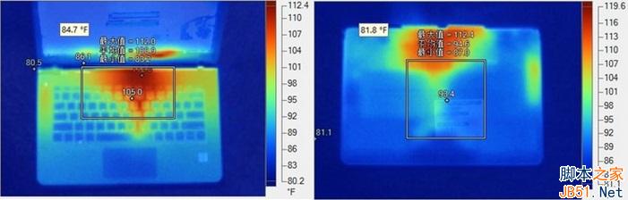 我们知道,华氏温度和摄氏温度的数学转换率为100华氏度=37.78摄氏度,上图中我们可以看到正面最高温度为112华氏度=44.4摄氏度,最低温度为83.2华氏度=28.44摄氏度;而背面温度最高为112.4华氏度=44.67摄氏度,温度最低为87华氏度=30.56摄氏度,由此我们可以看出该机整机散热效果十分不错,除了仰仗其优异的双风扇散热设计外,其全铝合金打造的金属机身也是极佳的散热导体,而且在实际使用过程中,我们也很难达到上图中CPU、显卡、硬盘都达100%的使用情况,因此温度相对此时测试的情况会更低一些。此外,从前后相差无几的温度差异,我们也能从侧面看出这款笔记本的超薄厚度。