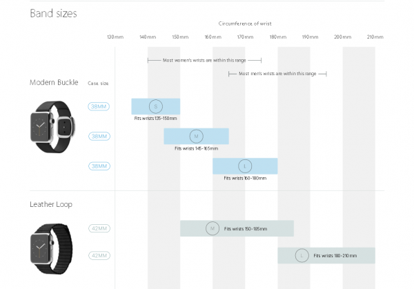 在这份选购向导中在38mm和42mm表盘适用的手腕周长有所重叠,这意味着在苹果的推荐中这批人能够驾驭两种尺寸的Apple Watch。当然,对于消费者最好的选择就是等4月24日正式发售之后到访就近的Apple Store进行现场试戴。