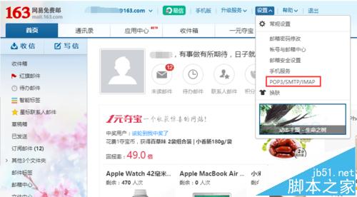 1、首先登陆关联的163网易邮箱,点击上方菜单栏里的【设置】选项,弹出下拉菜单,在下拉菜单里找到【POP3/SMTP/IMAP】选项,如下图所示。