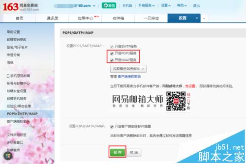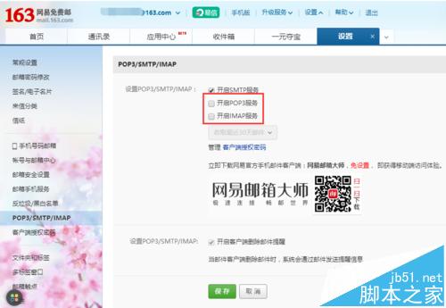 2、点击【POP3/SMTP/IMAP】选项,进入设置界面,勾选开启POP3服务和开启IMAP服务选项,如下图所示。
