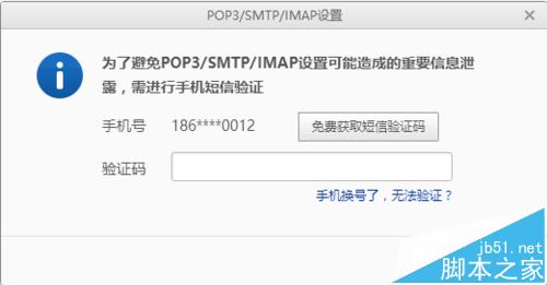 4、点击该界面里的免费获取短信验证码按钮,此时关联手机上会收到一条含有验证码的短信,将获取的验证码输入到指定位置,验证成功后即可开启邮箱的POP3和IMAP功能,如下图所示。