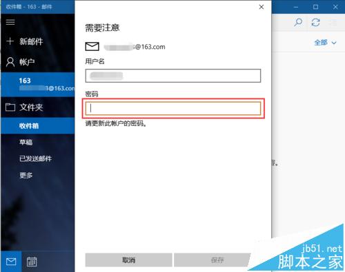 6、163网易邮箱设置完成之后,接下来返回到win10邮箱界面,点击刷新按钮,此时弹出输入密码窗口,需要注意的是这个密码并不是邮箱的密码,而是客户端授权密码,如下图所示。