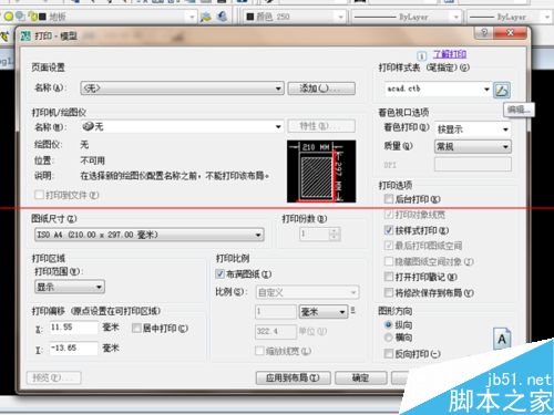 7、设置好之后,点击“保存并关闭”。回到“打印”,选择右下角的“图形方向”,再选择“居中打印”,“布满图纸”。在“图纸尺寸”中选择需要的尺寸,再点击“预览”,查看图纸。