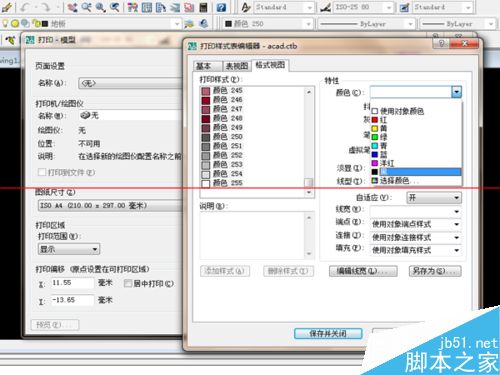 4、鼠标左键点击打印样式的“颜色1”,然后按住Shift键,拖动滚动条到最后的一个颜色,点击"颜色255",选择所有的颜色。再点击“特性”下的“颜色”的“▼”。在下拉菜单中选择黑色。不少的人在打印预览时会发现有的线性还是彩色的,这一步就避免了打印出现这种情况。