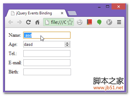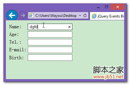 为了演示,我们检测如果用户输入了Name,我们再在下面创建一个输入框可以输入昵称。可以预见得到,这个后来通过JavaScript代码插入到DOM中的输入框其中不会有其他输入框一样的效果的。因为我们使文本自动被选中的代码是在页面加载时执行的,而页面加载时这个后来插入的输入框还不存在呢。
