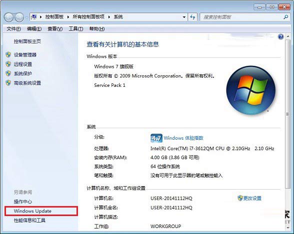 一、在Win7或者Win8电脑桌面中的“计算机”或者“这台电脑”上右键,然后点击“属性”。在打开的系统界面中,点击进入左下角的“Windows Update”,如下图所示。