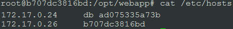 除了环境变量,Docker 还添加了 host 信息到容器的 /etc/hosts 文件中。下面查看web容器的 hosts 文件: