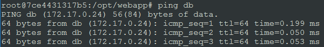 上图中有两个 host 信息,第一个是 db 容器的名称 ip 和主机名。第二个是 web 容器,web 容器用自己的 id 作为默认主机名。我们可以通过 ping 命令测试 web 容器到db容器的连接: