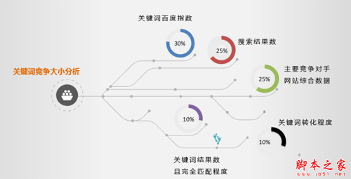 关键词竞争大小分析一定要结合关键词搜索指数、搜索结果数、主要竞争对手网站综合数所、关键词转化程度及关键词结果数几项进行分析;
