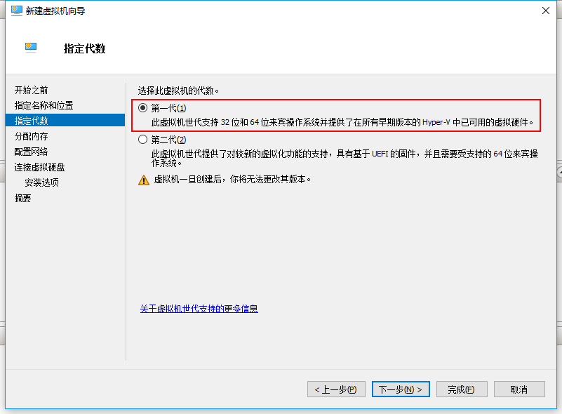 3、选择第一代虚拟机,至于和第二代的区别在哪,请看下图(PS:第二代貌似不支持我的电脑)