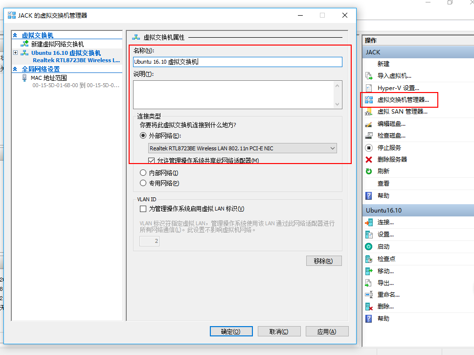 接下来就是配置一个虚拟网络以供虚拟机使用:选择管理器右边的虚拟交换机管理器,打开并创建一个外部虚拟交换机,设置好名称之后选择一个可以访问外网的网络适配器,最后不要忘记将其重新设置为虚拟机的网络适配器