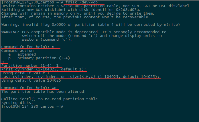 按照界面的提示,依次输入“n”(新建分区)、“p”(新建扩展分区)、“1”(使用第1个主分区),两次回车(使用默认配置),输入“w”(保存分区表),开始分区。