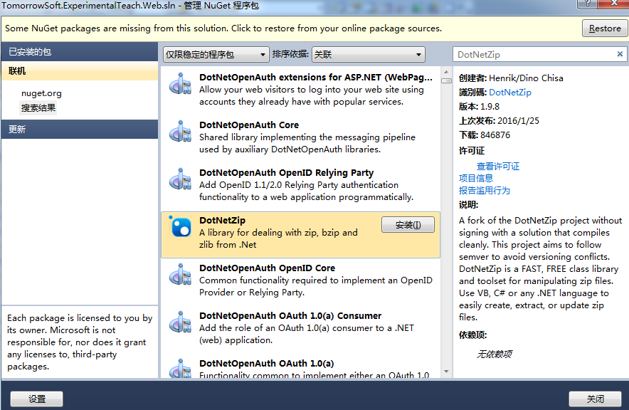 现在就可以使用DotNetZip强大的类库了,在这里我给出一些简单的使用。