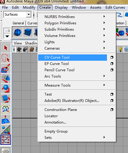 第一步:打开MAYA选择工程项目板surfaces(曲面)
