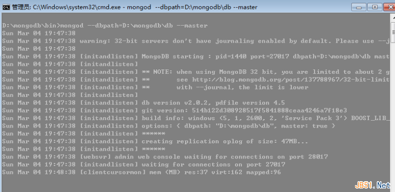第二步:启动D盘上的mongodb,把该数据库指定为主数据库,其实命令很简单:>mongodb --dbpath='XXX' --master,