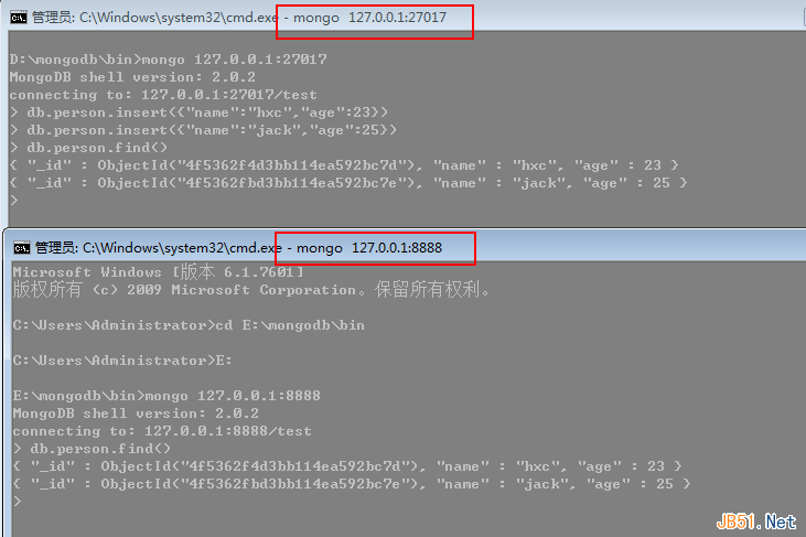 第三步:同样的方式启动E盘上的mongodb,指定该数据库为从属数据库,命令也很简单,当然我们要换一个端口,比如:8888。