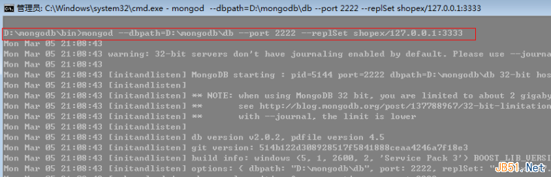 这里就把D盘里面的mongodb程序打开,端口为2222。指定端口为3333是shopex集群下的另一个数据库服务器。