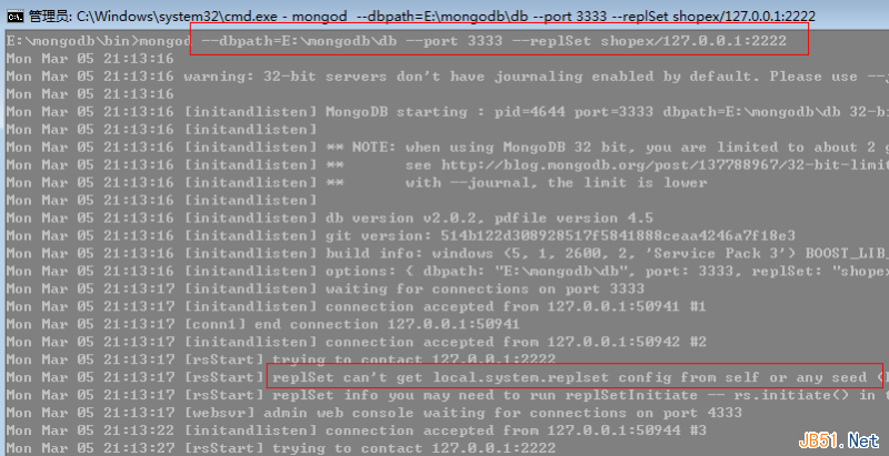 第三步: ok,看看上面的日志红色区域,似乎我们还没有做完,是的,log信息告诉我们要初始化一下“副本集“,既然日志这么说,那我也就