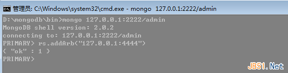 然后我们在admin集合中使用rs.addArb()追加即可。
