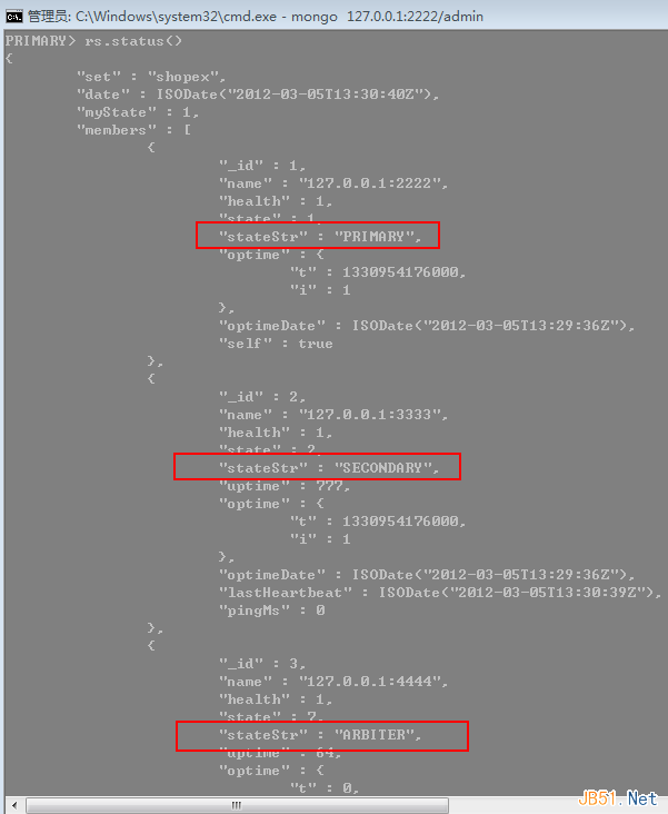 追加好了之后,我们使用rs.status()来查看下集群中的服务器状态,图中我们可以清楚的看到谁是主,还是从,还是仲裁。