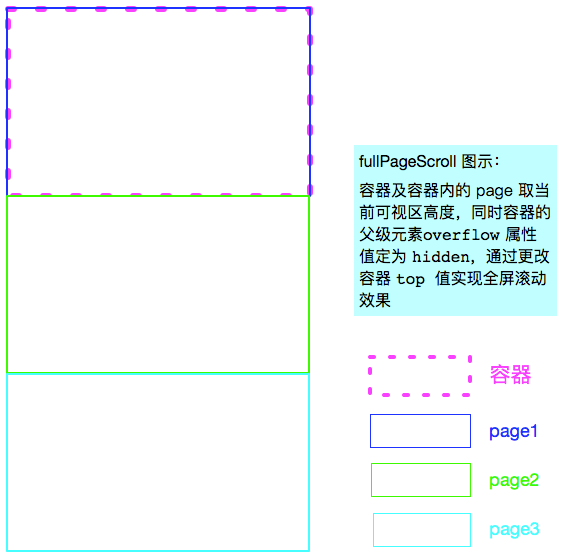 实现原理见下图:容器及容器内的页面取当前可视区高度,同时容器的父级元素 overflow 属性值设为 hidden ,通过更改容器 top 值实现全屏滚动效果。