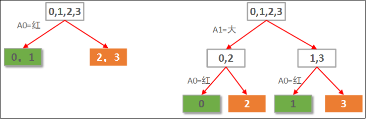 显然左边先使用A0(红色)做划分依据的决策树要优于右边用A1(大小)做划分依据的决策树。