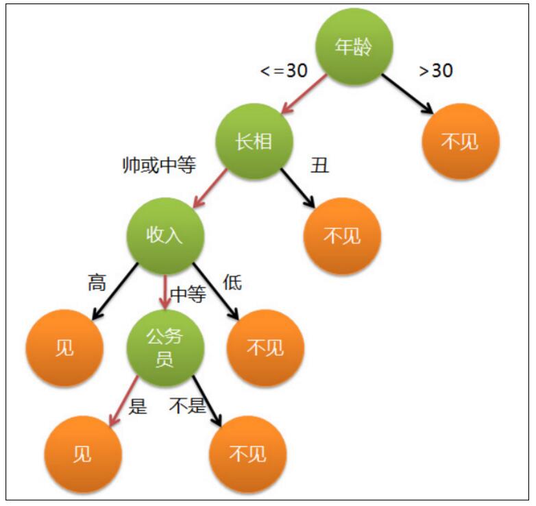假设这个女孩对男人的要求是:30岁以下、长相中等以上并且是高收入者或中等以上收入的公务员,那么这个可以用下图表示女孩的决策逻辑