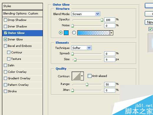 15.打开混合选项窗口并设置外发光和内发光的参数如下图所示