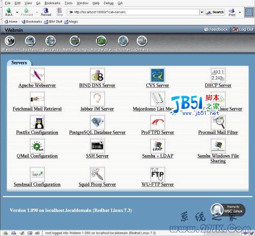 Servers 窗体可以对您可能会在系统中运行的各个服务进行配置。BIND 和 DHCP 工具非常便捷。同时 Samba 工具也很好用,可以为 Windows 和其他客户机配置文件和打印机的共享。SMTP 服务器 Sendmail 以其极复杂的配置文件而出名。Webmin Sendmail 工具同样为您解决了这一问题。