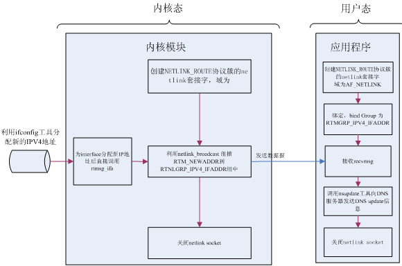本文讨论的重点是针对 DDNS 这一特定的应用,演示 rtnetlink 检测到 IP 地址发生了变化、并将消息告知用户空间的应用程序的整个过程,以及应用程序利用 netlink 套接字接收消息、并告知 DNS 服务器的实现方法。