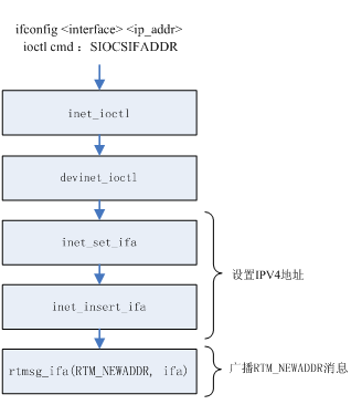 引起主机 IP 地址变化的原因有很多种,如:DHCP 分配的 IP 过期、用户手动修改了 IP 等等。无论何种原因,最终都会触发内核空间对相应事件的通知机制,这里以最常用的修改 IPV4 地址的工具 ifconfig 为例。