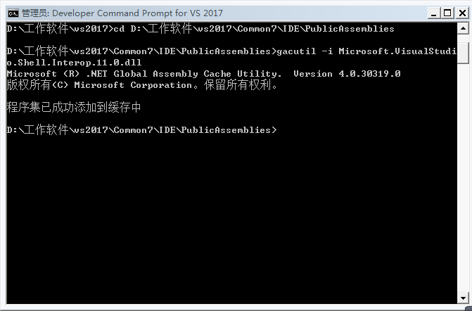 CD CD C:\Program Files\Microsoft Visual Studio\2017\Community\Common7\IDE\PublicAssemblies 然后回车(注:这里的CD C:\Program Files\Microsoft Visual Studio\2017\Community\Common7\IDE\PublicAssemblies 是你的安装目录下的路径 , 如:我是安装在D盘下的VS017,那么我的路径就是 D:\工作软件\vs2017\Common7\IDE\PublicAssemblies)