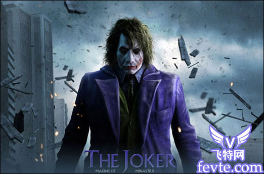 渲染完所有的图片后我把它们全部都放到photoshop里的同一个"pad"文件中。接着开始后期制作,比如背景楼房,画面气氛,碎片(在背景做好后用了maya的"几何形绘画工具"来做的)。雨点由三个图层组成,每个图层都是用"maya paint effects"来做的,在photoshop里调整了颜色和混合模式。其中两个放在角色后面,另一个放在前面。在角色身上我做了一些加工,特别是在头发上。在画面的底部和顶部加了一些材质,都只是用了些基本的photoshop功能。最后,把蝙蝠侠的标志加上去就大功告成了。