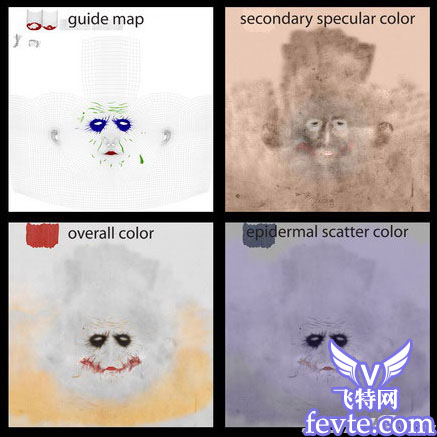 对我而言绘制贴图占用了我大部份的时间。我通常用photoshop和zbrush,对于细节调整我使用了projection master。对于那些在photoshop里很难辨认的区域,有时我会用被我称为"指引图"的东西。"指引图"是用zbrush做出来的。例如,我用photoshop来为脸部做材质,有时实在很难找出哪里是嘴唇哪里是眼睛,或者某条皱纹该在什么地方。这时候,"指引图"就能派上用场。我知道还有其它一些方法来解决这个问题,不过我习惯了这个方法。我相信无论采用哪种方法,只要能达到整洁的效果和不耗费太多时间就可以了。