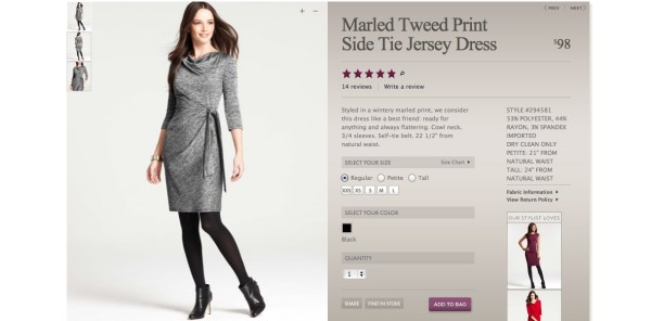 Ann Taylor gets it right将大部分的页面空间贡献给了高质量产品图片,同时提供大量额外的产品信息。你可以在这里找到非常多的产品细节,比如不同尺寸裙子的长度,纺织品的质地等等。但是这些信息并没有喧宾夺主,页面上更重要的信息,例如产品价格和用户评分,依然占了大头。