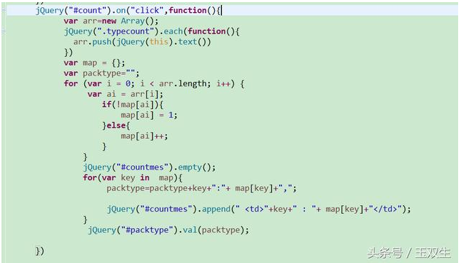 js去除重复并统计数量方法 首先点击按钮触发事件,然后用class选择器,迭代要获取的文本(这里最好用text()方法)加入到Array()集合里。然后创建一个map{},遍历Array()集合,取一个值作为map的key,然后判断是否有值,如果没有就输入值1,如果有就累加1.最后就可以统计出重复的有多少个。
