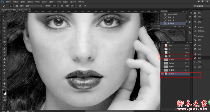 2.进入图层通道发现蓝色通道比较便于磨皮,快捷键Ctri+5,所以选择蓝色通道并复制